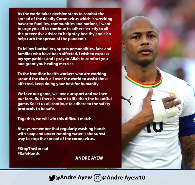 Sharing his thoughts, Andre Ayew wrote on social media to encourage affected and unaffected families and friends to weather the storm as the world fights the deadly virus.