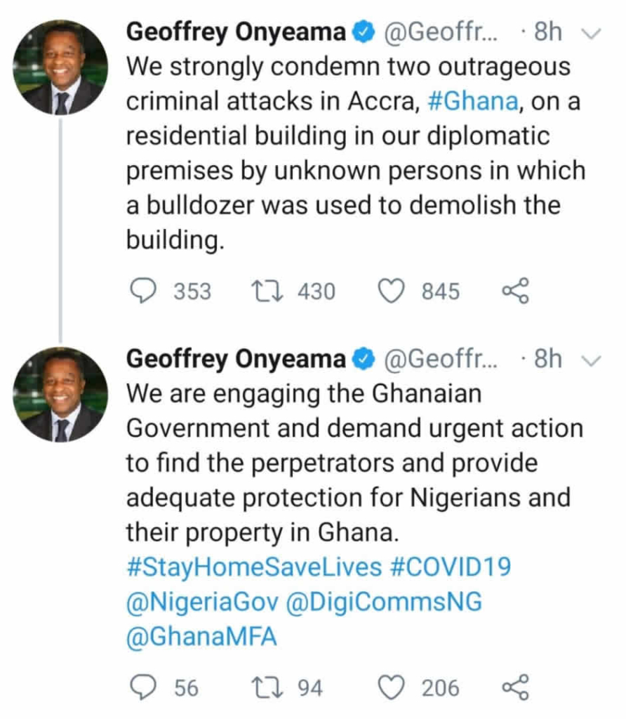 Mr Onyeama added that his office is engaging the government of Ghana and “demand urgent action to find the perpetrators and provide adequate protection for Nigerians and their property in Ghana.”