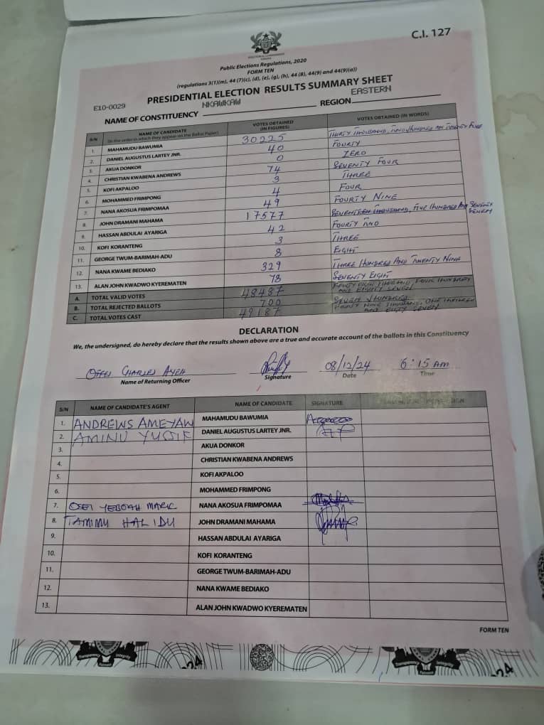 The provisional presidential election results from the Nkawkaw constituency have been released, showing the New Patriotic Party (NPP) leading with 30,225 votes.