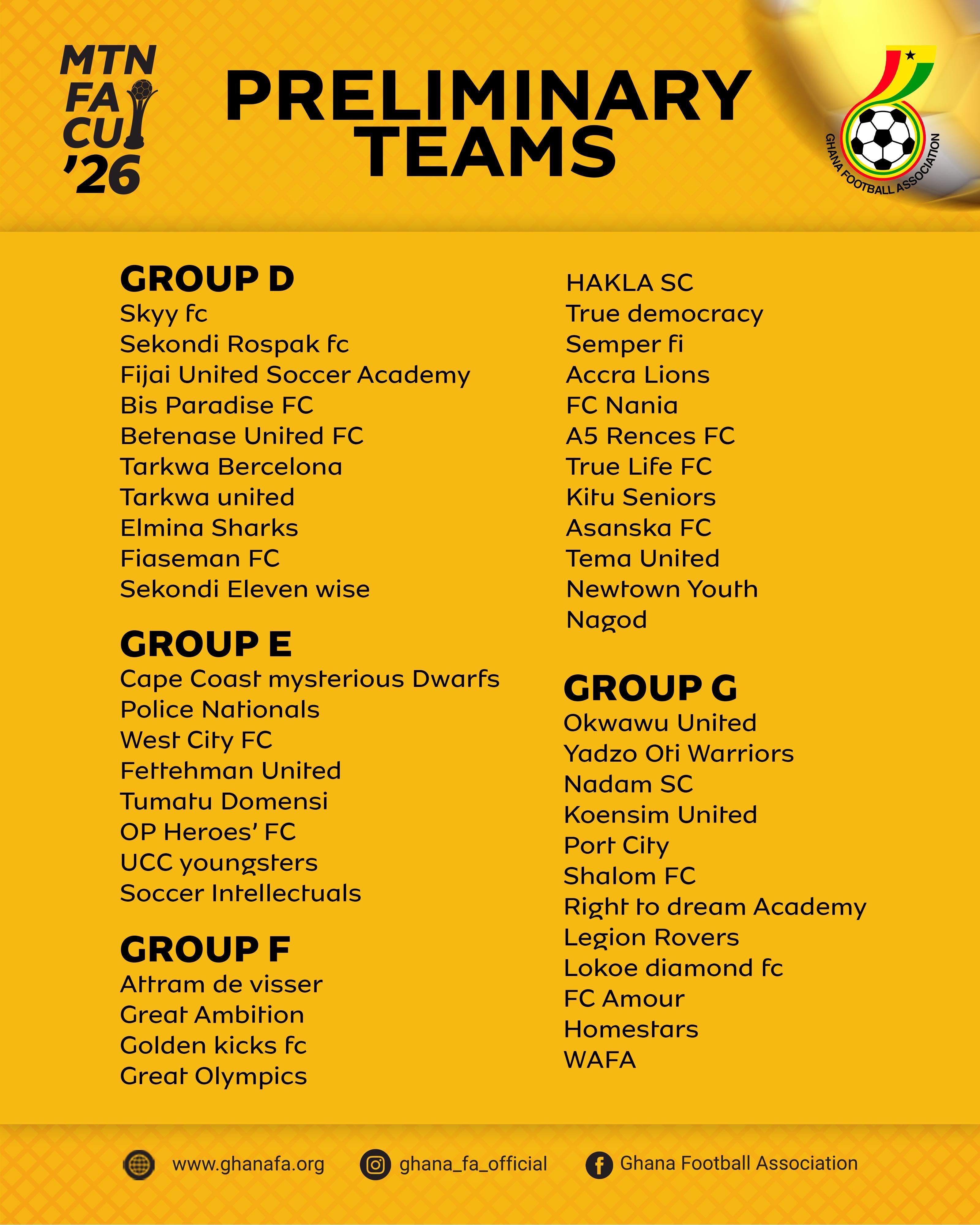 The draw for the preliminary stage of the 2025–26 MTN FA Cup will take place at the Football Association headquarters in Accra on Thursday, October 9, 2025.