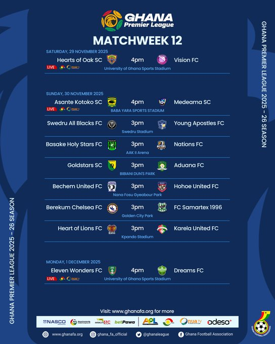 The 2025/26 Ghana Premier League resumes this weekend with Matchday 12, featuring a full slate of fixtures across the country.