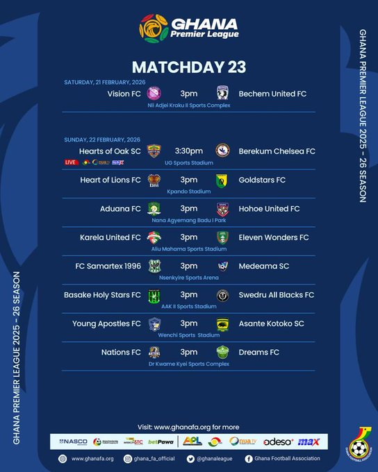 The 2025/26 Ghana Premier League enters Matchday 23 this weekend, with matches scheduled across multiple venues from Saturday, February 21, through Sunday, February 22.