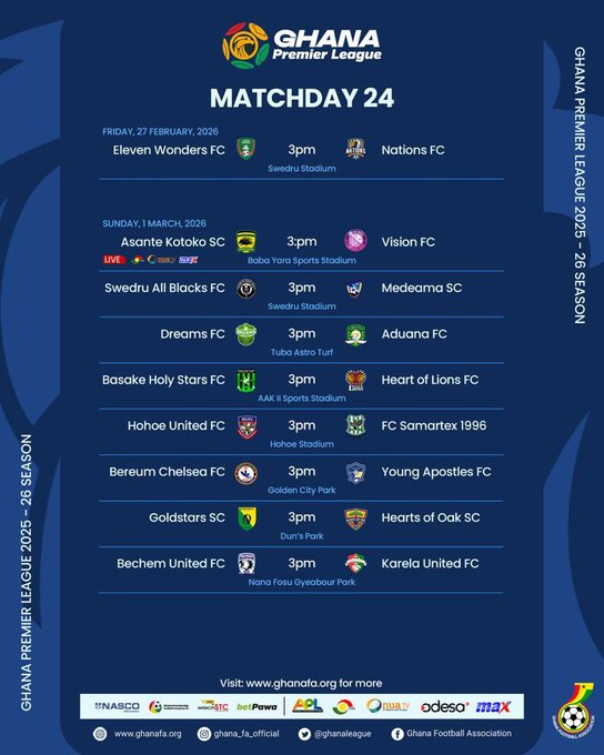 Matchday 24 of the 2025/26 Ghana Premier League gets underway this weekend, with fixtures spread across centres nationwide as the campaign gathers momentum.