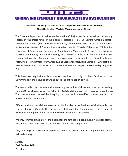 The Ghana Independent Broadcasters Association (GIBA) has expressed deep sorrow over the tragic deaths of eight Ghanaians, including two cabinet ministers, in a helicopter crash that occurred on Wednesday, August 6, 2025, en route to Obuasi in the Ashanti Region.