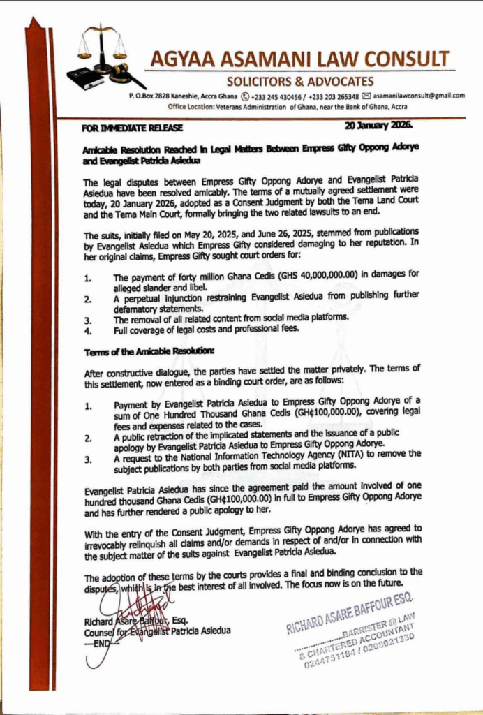 Under the agreement, Evangelist Asiedua paid GH¢100,000 to Empress Gifty to cover legal fees and related expenses, issued a public apology, and retracted the statements that prompted the lawsuits.