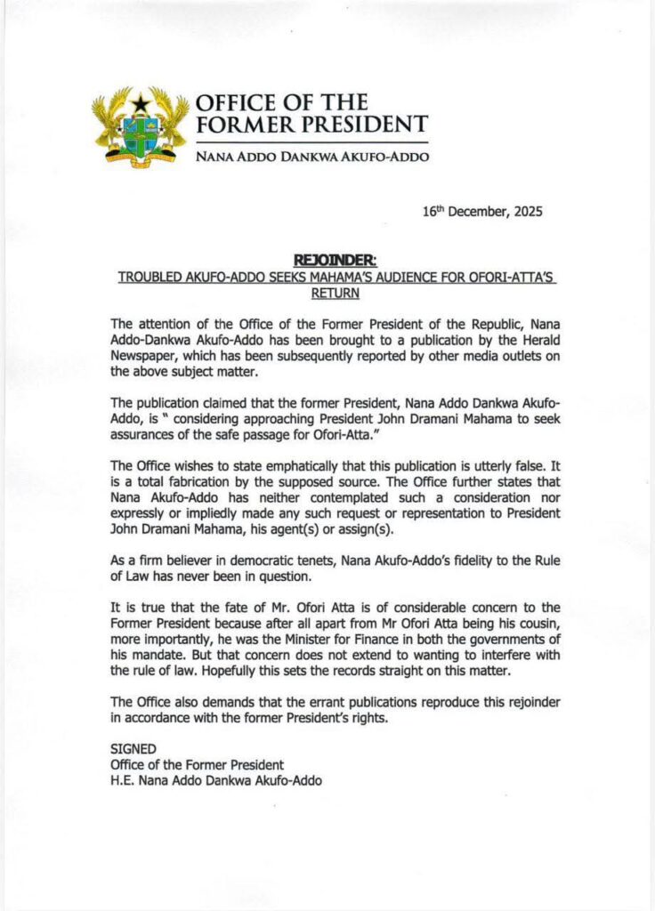 The Office of former President Nana Addo Dankwa Akufo-Addo has strongly denied claims that he is seeking assurances from President John Dramani Mahama for the safe return of former Finance Minister Ken Ofori-Atta.
