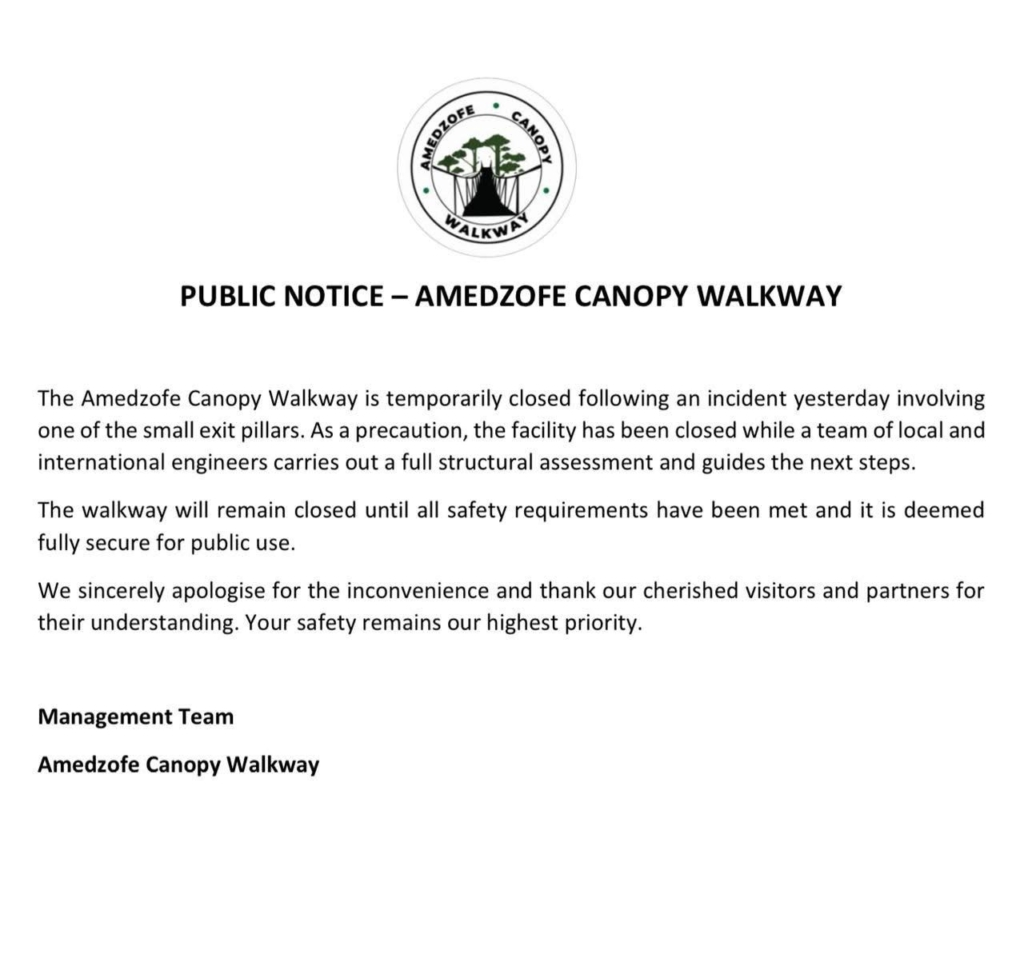The Amedzofe Canopy Walkway in the Volta Region has collapsed, leaving several visitors with minor injuries and prompting the immediate closure of the popular tourist attraction.