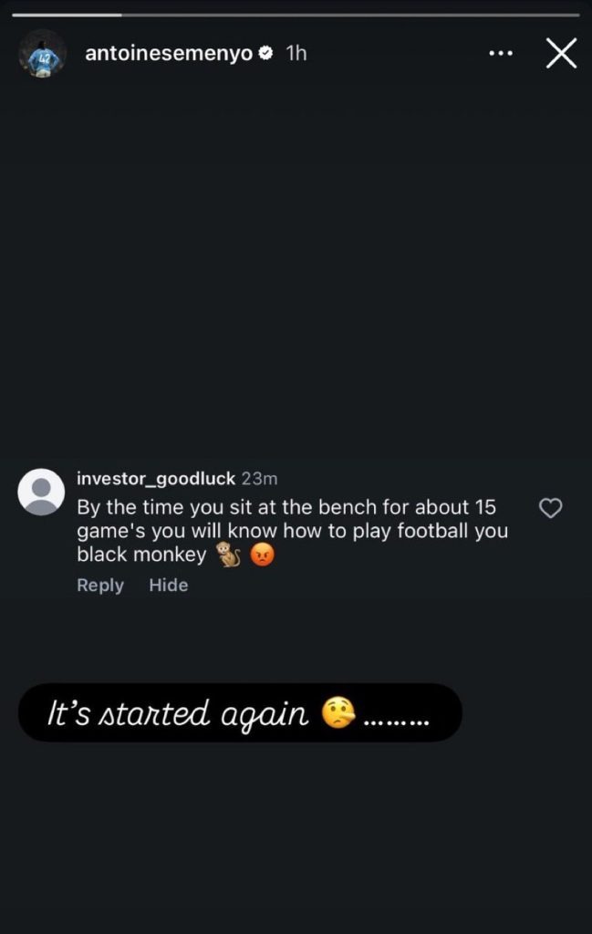 Semenyo, who completed the full 90 minutes, later shared a post on Instagram celebrating the victory but was met with a racially abusive comment.
