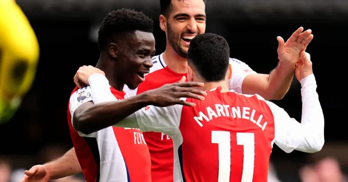 Arsenal dominated from kick-off and took the lead in the 14th minute when Bukayo Saka’s cross into the box was helped on by a slight touch from Martin Odegaard and turned into the net by Leandro Trossard.