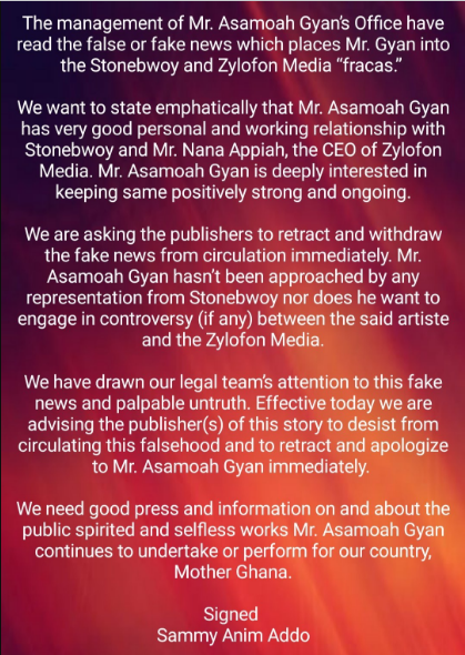But in a press release, Mr Sammy Anim Addo, the Chief Executive Officer of Baby Jet Promotions said “the management of Mr Asamoah Gyan’s office has read the false or fake news which places Mr Gyan into the Stonebwoy and Zylofon Media “Fracas”.