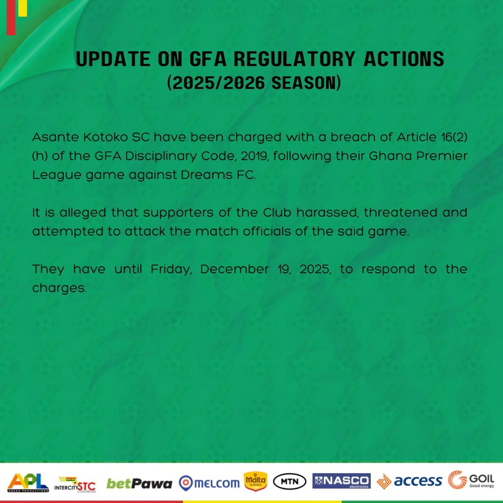 Asante Kotoko have been given until Friday, December 19, 2025, to submit their response to the charges.