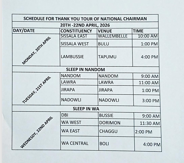 National Chairman of the National Democratic Congress (NDC), Johnson Asiedu Nketia, is set to begin a three-day thank-you tour of the Upper West Region starting Monday, April 20, 2026.