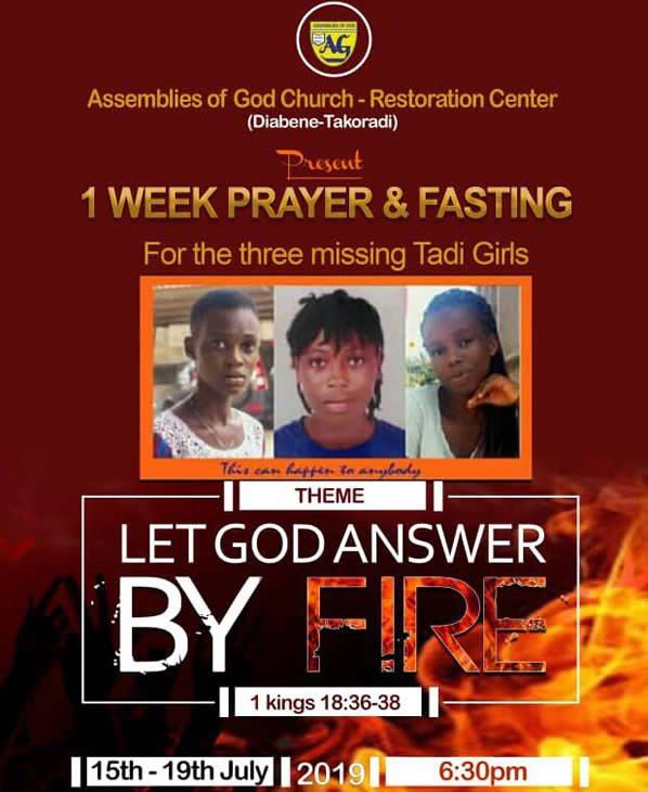An Assemblies of God church in Takoradi has begun a seven-day fast asking for divine intervention in the state’s effort to find three kidnapped girls.