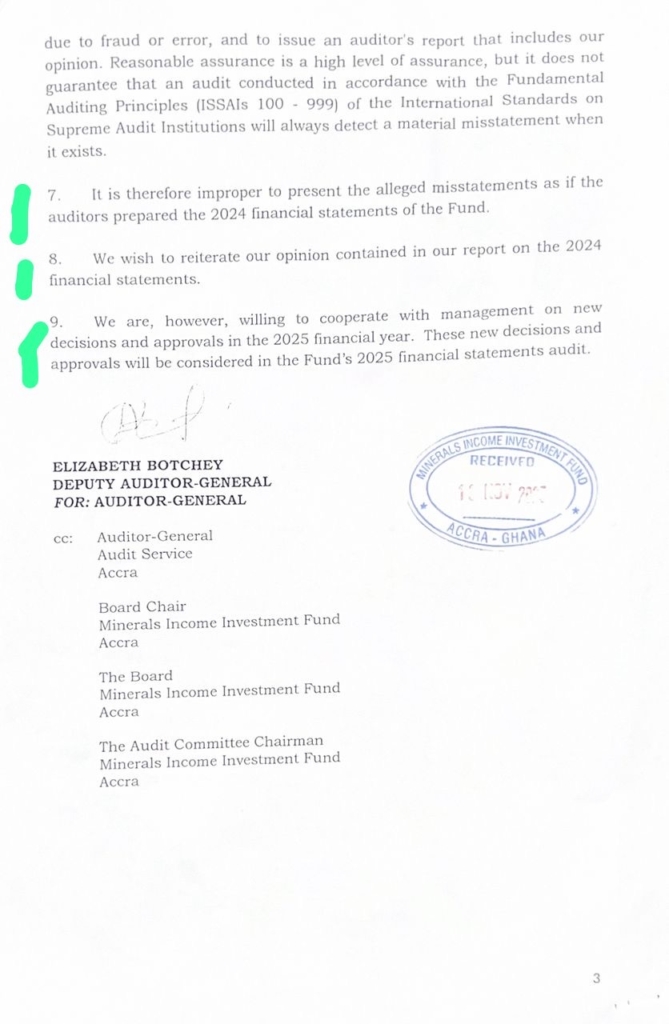 The Auditor-General’s Department has dismissed calls from the Minerals Income Investment Fund (MIIF) to review and restate its 2024 audited financial statements.