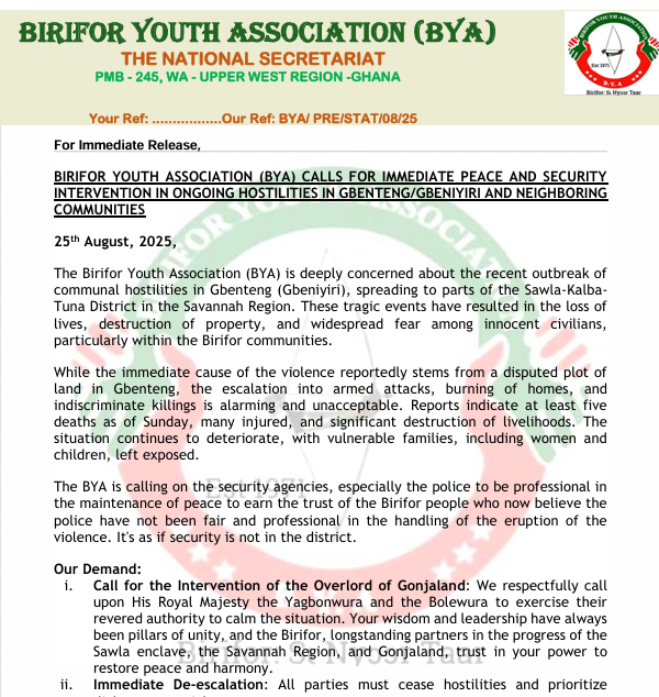 The Birifor Youth Association (BYA) has sounded the alarm over renewed communal violence in Gbenteng (Gbeniyiri) and parts of the Sawla-Tuna-Kalba District in the Savannah Region, which has reportedly left at least five people dead and several others injured.
