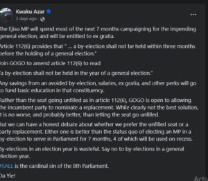 Kwaku Azar made this observation in a Facebook post, stating the Ejisu MP will spend most of the next 7 months campaigning for the impending general election, and will be entitled to ex gratia.