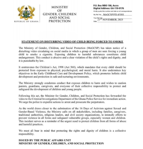 In a statement issued on Friday, November 21, the Ministry condemned the act as blatant child endangerment, emphasizing that exposing a child to harmful substances constitutes abuse and violates the child’s rights and dignity under Ghanaian law.