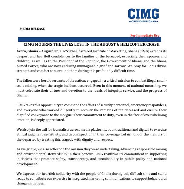 The Chartered Institute of Marketing, Ghana (CIMG), has expressed deep sorrow over the tragic helicopter crash that claimed the lives of several high-profile government officials and military personnel on August 6, 2025.