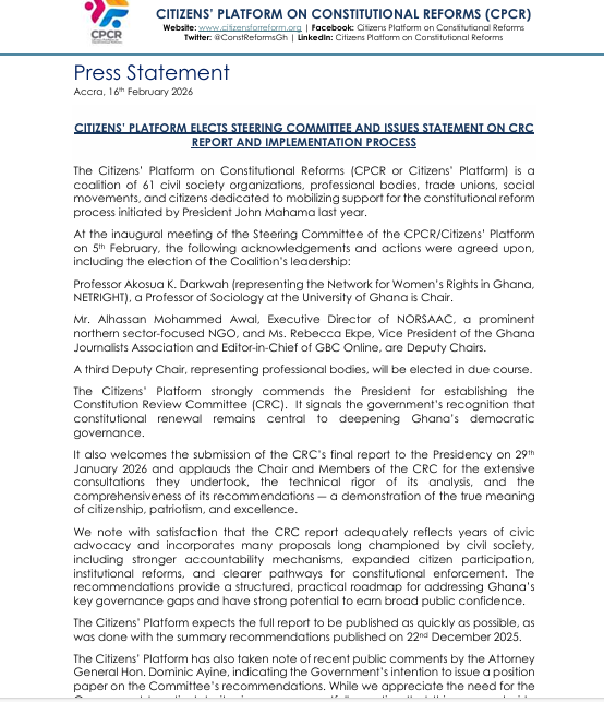 In a press statement issued in Accra on February 16, 2026, the Platform commended the President for establishing the Constitution Review Committee (CRC), describing it as a significant step toward deepening democratic governance.