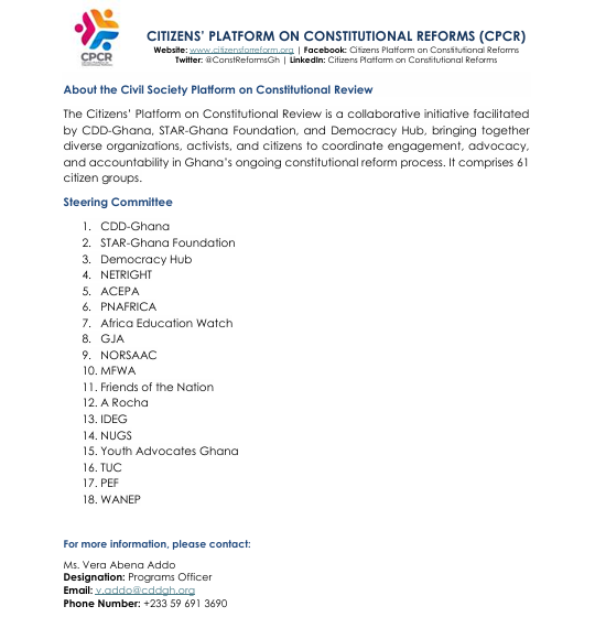 The Citizens’ Platform on Constitutional Reforms (CPCR) has elected a new Steering Committee and reaffirmed its support for the ongoing constitutional reform process initiated by President John Mahama.