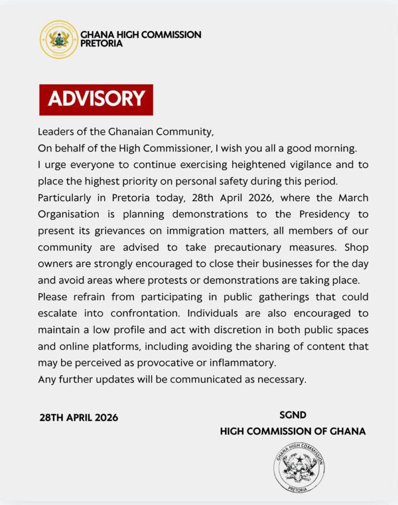 The Ghana High Commission, Pretoria has advised Ghanaians living in South Africa to remain cautious ahead of planned demonstrations over immigration concerns.