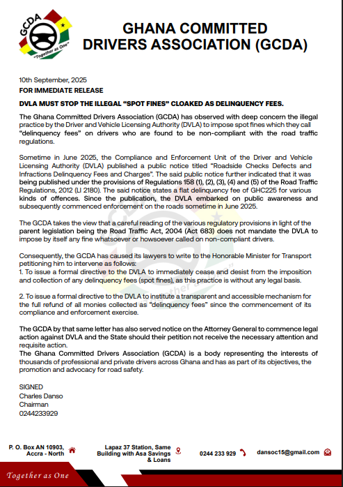 The Ghana Committed Drivers Association (GCDA) has urged the Driver and Vehicle Licensing Authority (DVLA) to immediately stop what it describes as the “illegal” imposition of spot fines on drivers.