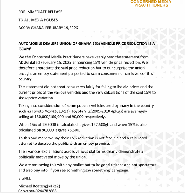 A group calling itself the Concerned Media Practitioners has described the 15 per cent vehicle price reduction announced by the Automobile Dealers Union of Ghana (ADUG) as misleading and lacking transparency.