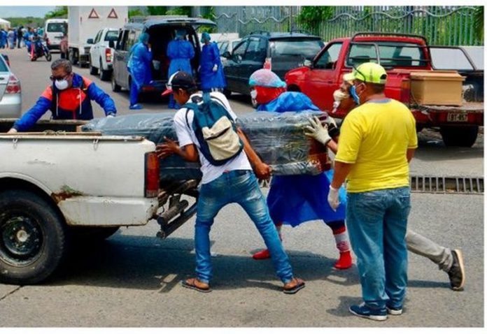 A coffin containing the body of a person who is supposed to have died from Covid-19 lays wrapped in plastic and covered with cardboard, outside a block of family apartments in Guayaquil on April 2.