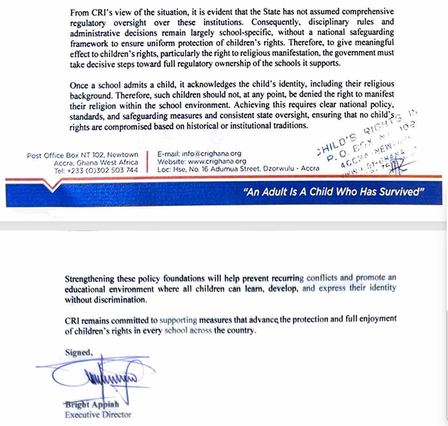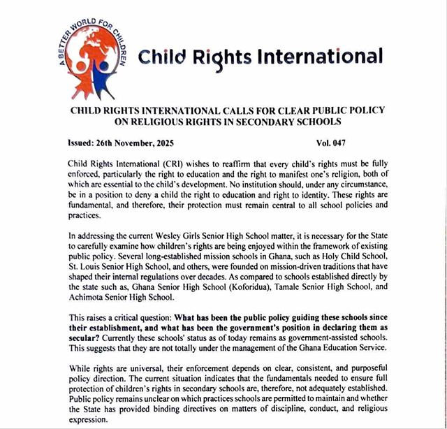 Child Rights International (CRI) is urging the government to urgently develop a clear and binding public policy to regulate religious rights and identity in secondary schools across the country.