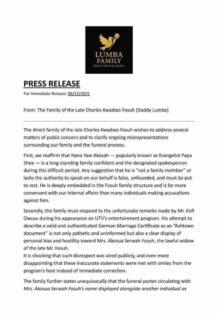 The family of the late highlife legend Charles Kwadwo Fosuh, popularly known as Daddy Lumba, has moved to clarify public misrepresentations regarding the funeral arrangements and the status of his widow, Mrs. Akosua Serwah Fosuh.