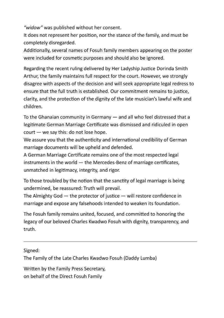 The family strongly defended the legitimacy of Mrs. Fosuh’s German marriage certificate, condemning remarks by Mr. Kofi Owusu on an entertainment programme where he dismissed it as an “Ashtown document.”
