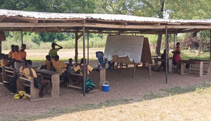 During a visit, Adom News observed teachers combining Nursery 1, 2, and Class 1 students in a single room, while some classes were held under a mango tree. The school also lacks essential facilities, including student furniture, a staff room for teachers, and other materials necessary for effective learning.