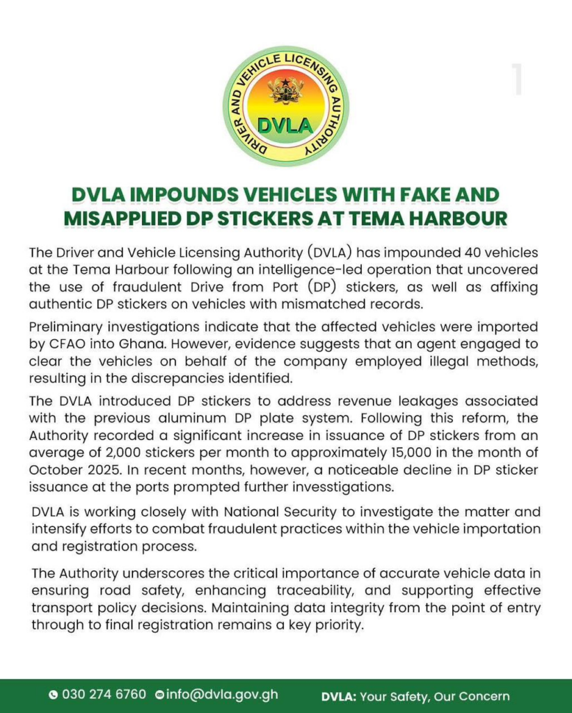 The Driver and Vehicle Licensing Authority (Driver and Vehicle Licensing Authority) has impounded 40 vehicles at Tema Harbour after uncovering the use of fake and improperly applied Drive from Port (DP) stickers.