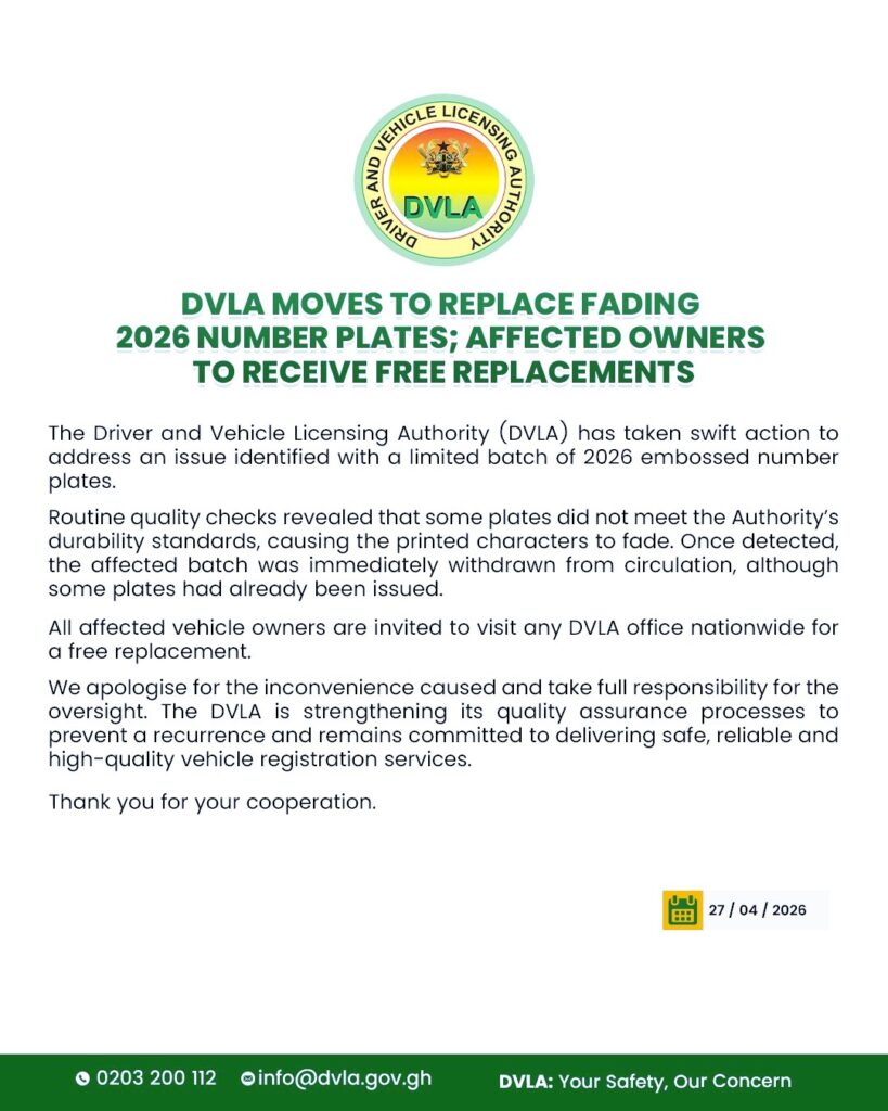 The Driver and Vehicle Licensing Authority (DVLA) has announced plans to replace a batch of 2026 embossed number plates found to be defective, at no cost to affected vehicle owners.