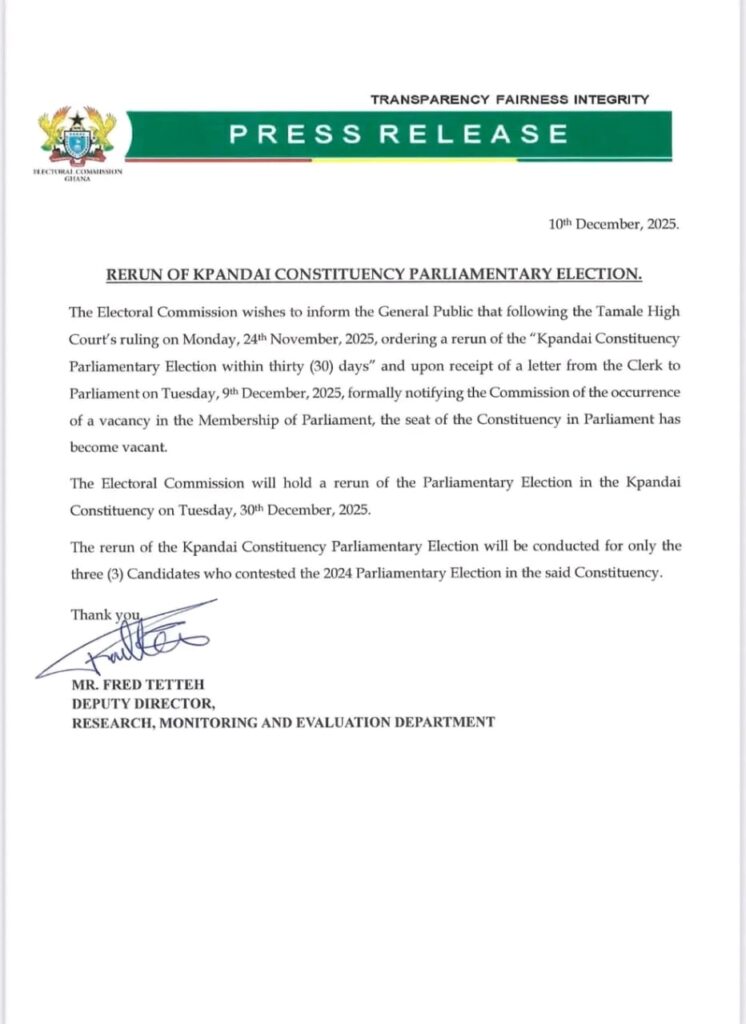 The Electoral Commission has scheduled a rerun of the Kpandai Constituency Parliamentary Election for Tuesday, December 30, 2025.
