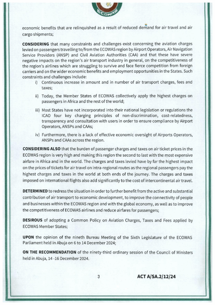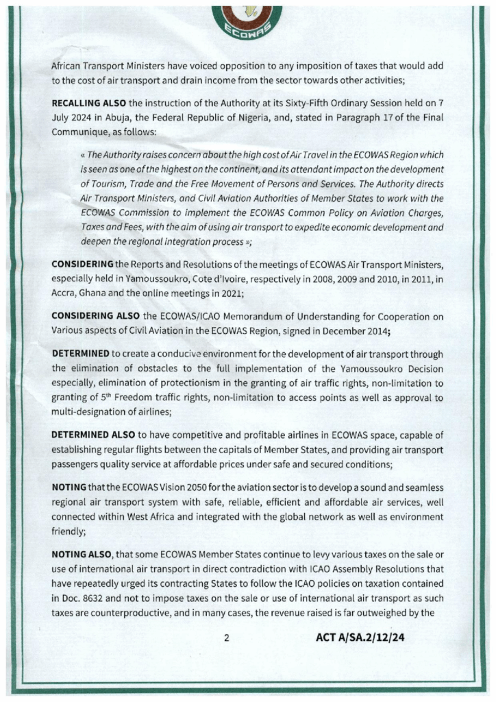 The decision, taken by the Heads of State and Government at the December 2024 Summit in Abuja, is anchored in a new Supplementary Act on Aviation Charges, Taxes and Fees.