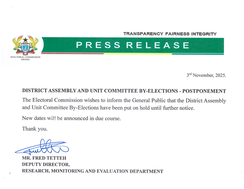 The Electoral Commission (EC) has announced the postponement of the District Assembly and Unit Committee by-elections originally scheduled for Tuesday, November 11, 2025.