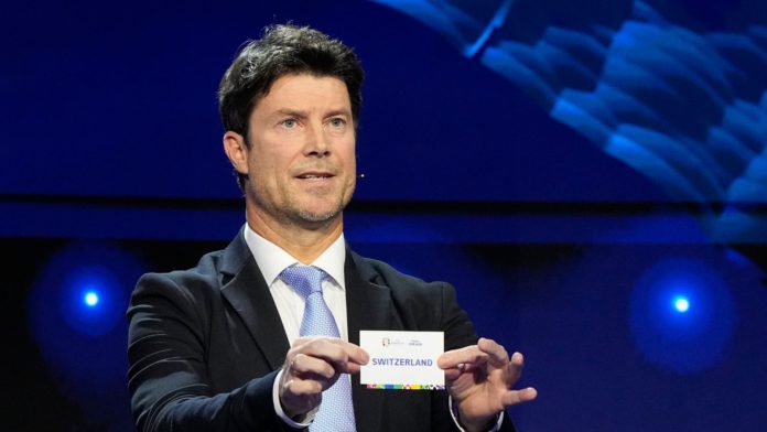 Lewd noises could be heard as Switzerland were drawn in Group A with Scotland, Hungary and hosts Germany.