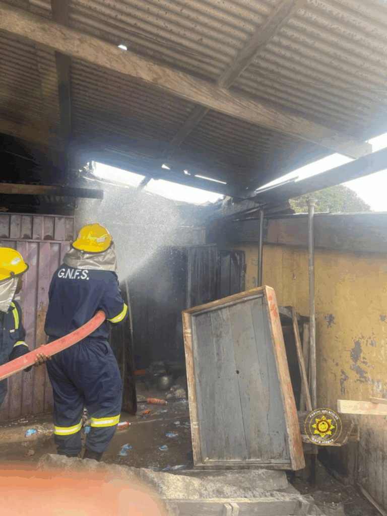 Firefighters from the Ghana National Fire Service arrived at 10:04 a.m. to find the shop heavily engulfed. Although they brought the flames under control within minutes, the container and its contents were already partially destroyed.