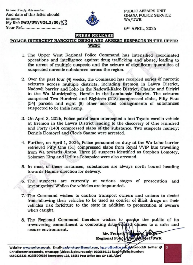 Earlier, on April 1, 2026, police at the Wa-Loho barrier intercepted a Royal VVIP bus travelling from Wa to Jirapa, recovering 51 compressed slabs. Three individuals—Stephen Lomotey, Solomon King, and Urilius Tobopalee—were arrested in connection with that seizure.