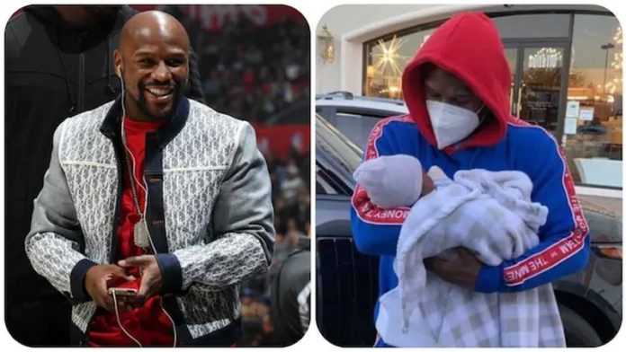 Mayweather, who was dressed in blue and red hooded cotton sportswear with a face mask, was looking straight into the eyes of his first grandson.