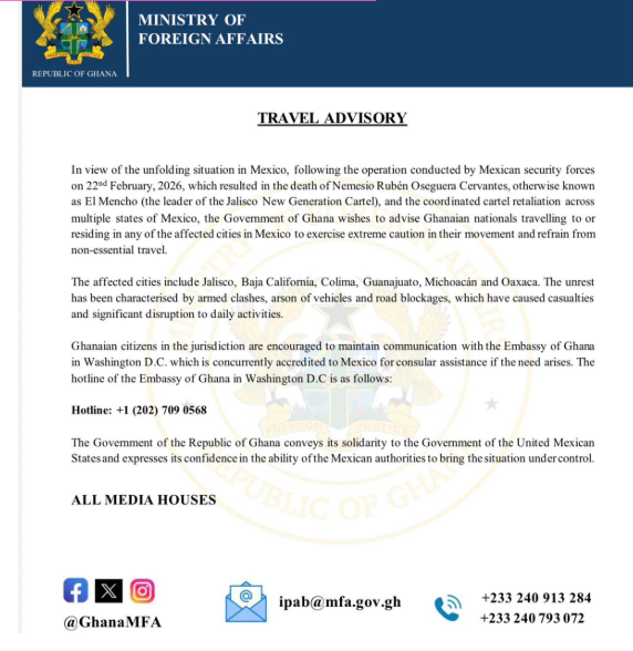 According to the Ministry, the operation has triggered coordinated retaliatory attacks by cartel elements across several Mexican states, raising safety concerns for foreign nationals, including Ghanaians.