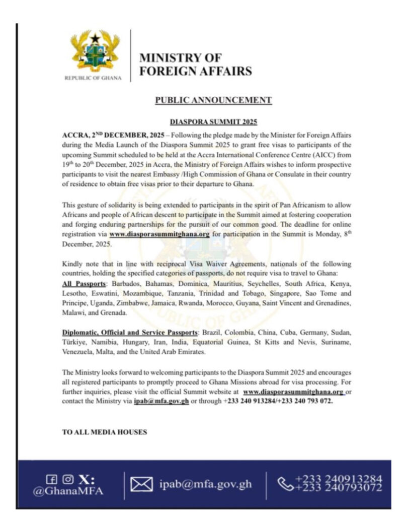 The Ministry of Foreign Affairs has announced that participants of the upcoming Diaspora Summit 2025 will receive free visas to attend the event, scheduled for December 19–20, 2025, at the Accra International Conference Centre (AICC).