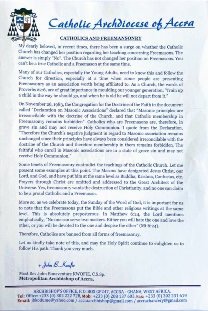 The Catholic Archdiocese of Accra, on January 27, reaffirmed its stance against Freemasonry, emphasising that Catholics cannot be members of Masonic associations without violating Church doctrine.
