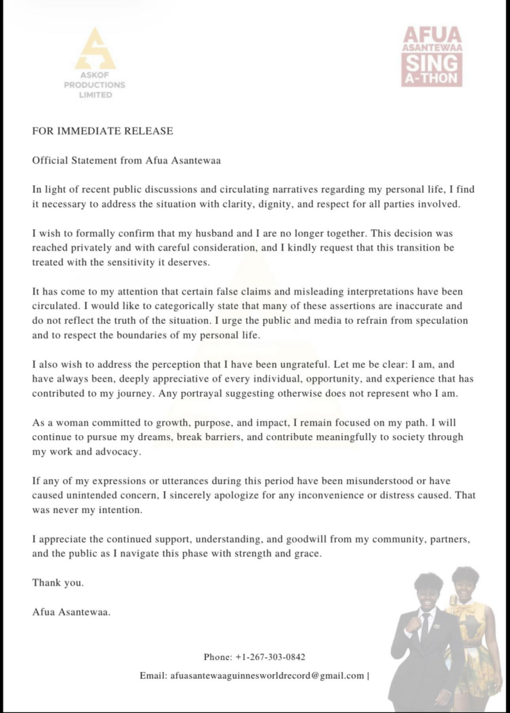 The development marks a significant moment in the public life of the woman who gained national recognition through her marathon sing-a-thon attempt, positioning her as a cultural ambassador for Ghana, while drawing a firm line around her private life.