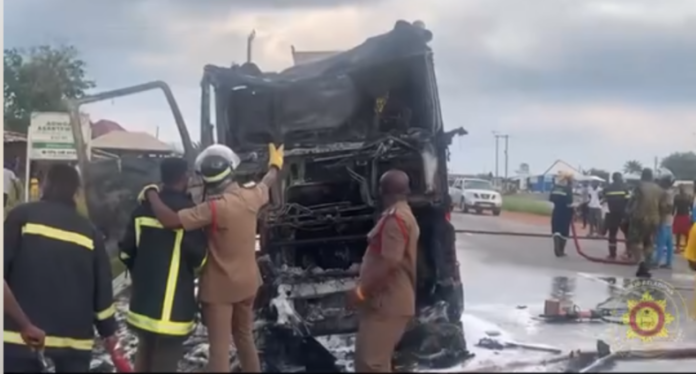 Responding to a distress fire call on the Accra-Kumasi Highway, firefighters from Suhum Fire Station, led by STNO II Darwah Prince Ofobi, averted a potential disaster involving a blazing Man Diesel Fuel Tanker with registration number GS 5343-18.