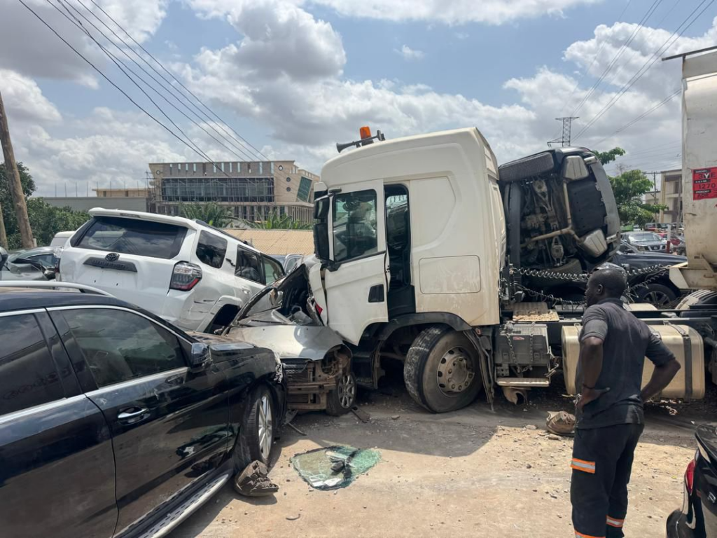 The tanker, which was transporting about 54,000 litres of petrol, reportedly crashed into several used vehicles displayed for sale at a roadside garage near +2 Pub, causing significant damage.