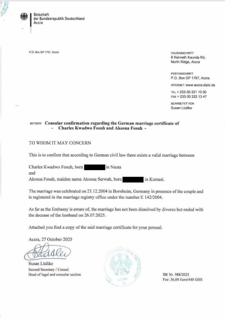 In a statement, the family said the Embassy had, in a letter dated October 27, 2025, verified that under German civil law, there exists a valid marriage between Charles Kwadwo Fosu and Akosua Serwah, which was celebrated on December 23, 2004, in Bornheim, Germany.