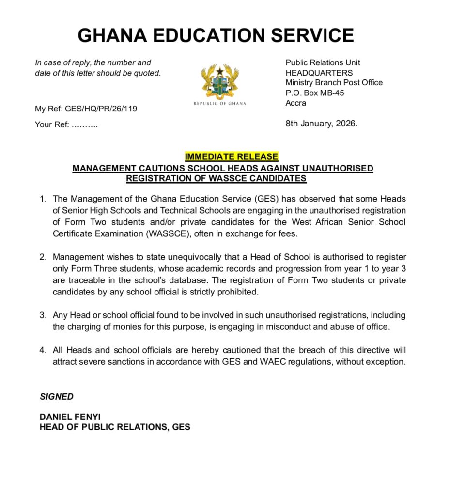 The Ghana Education Service has issued a strong caution to heads of Senior High Schools and Technical Schools over the unauthorised registration of students for the West African Senior School Certificate Examination (WASSCE).
