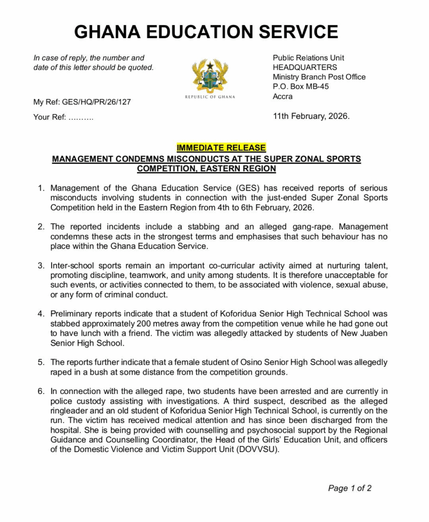 The Ghana Education Service (GES) has strongly condemned a stabbing and an alleged rape involving students during the recently concluded Super Zonal Sports Competition in the Eastern Region, describing the incidents as unacceptable and promising decisive action.